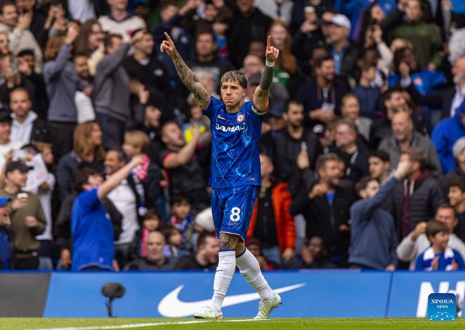 Chelsea's Enzo Fernandez celebrates after scoring the first goal during the English Premier League match between Chelsea FC and Liverpool FC in London, Britain, May 4, 2025. (Xinhua)