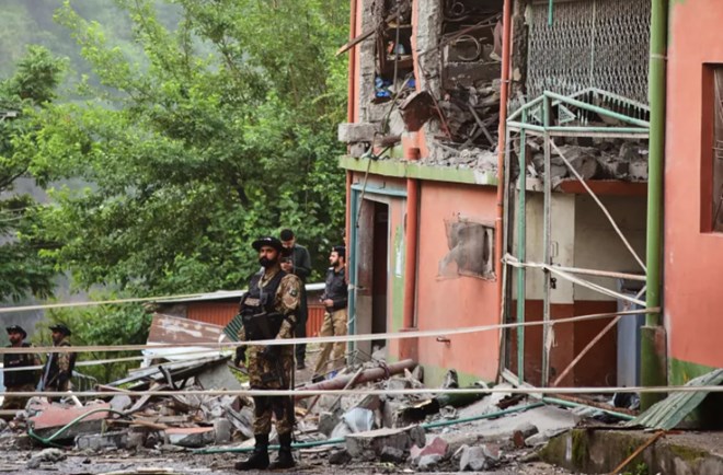 Army soldiers stand guard at a mosque building damaged by a suspected Indian missile attack near Muzaffarabad, the capital of Pakistan-administered Kashmir, on Wednesday, May 7, 2025 [MD Mughal/AP Photo]