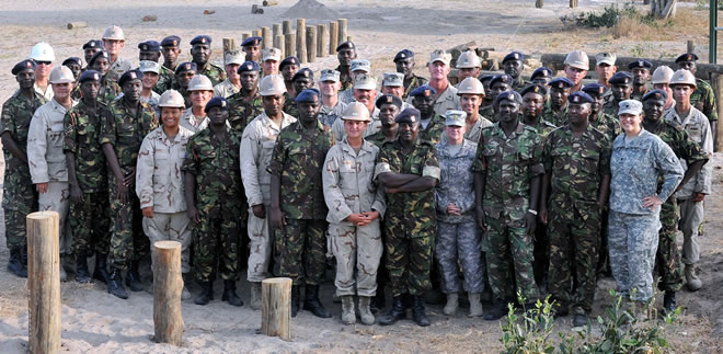 Members of the Kenyan Ministry of Defense and Kenyan Army Engineers Civil Affairs Teams (KCA), 12th Headquarters Engineers Brigade, partnered with U.S. military units assigned to Combined Joint Task Force – Horn of Africa conduct civil-military operations (CMO) operations in Manda Bay, Kenya. U.S. Army photo by Spc. Sheri Carter