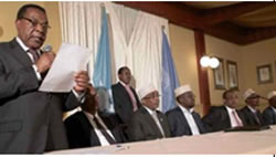 ![]() Special Representative of the Secretary-General (SRSG) for Somalia, Dr. Augustine Mahiga reads out the text of the Joint Communiqué of the Consultative Meeting of the Signatories of the Process for Ending the Transition by all signatories to the roadmap in Nairobi, on 22 June 2012 |