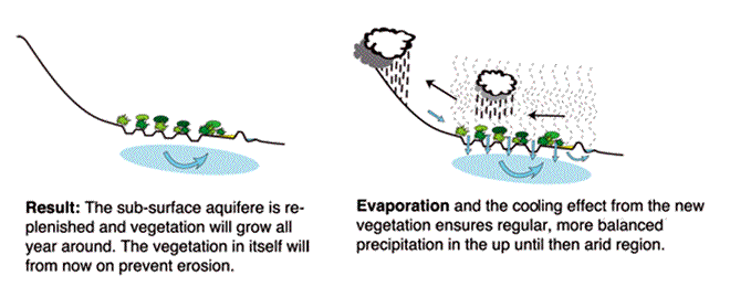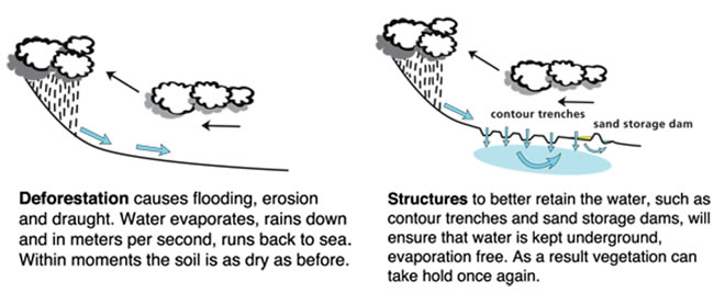 It is essential to improve the water collection capacity of soil in order to tackle desertification and soil erosion. This is achieved with the help of so-called contour trenches. These are trenches that follow the contours of the landscape and capture the rainwater flowing downwards above ground. Using these trenches, destructive above-ground water flows no longer erode the soil; wash away the fertile top soil and any vegetation still present. These trenches mean that water flows underground, resulting in the creation of an underground water supply. This underground water supply is used not only as drinking water by humans and animals, but also stimulates the growth of natural vegetation and of the agricultural crops planted. Besides laying contour trenches, a number of other elements are introduced – stone walls and tree coppicing, for example – which optimizes the effective water-holding capacity of the flow area, erosion is stopped and regulated evaporation is responsible for the achievement of a better local and regional climate.