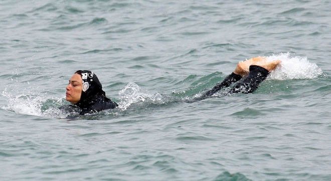 A woman wearing a burkini, a swimsuit that leaves only the face, hands and feet exposed, as she swims at Marseille, France. Credit Reuters