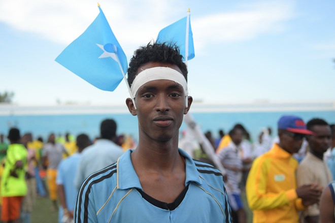 A youth with Somali flag on his head at a ceremony to mark International Sports Day for development and peace in Mogadishu on April 06, 2017. UN Photo / Ilyas Ahmed