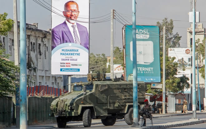 Security forces block a street with an armoured personnel carrier during protests against the government and the delay of the country's election in the capital Mogadishu, Somalia, Feb 19, 2021. [AP Photo]