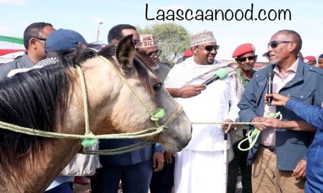 Garaad Jaamc Garaad Ismaaciil oo faras Laascannodd ku guddoonsiinaya Madaxweyne Muuse Biixi.