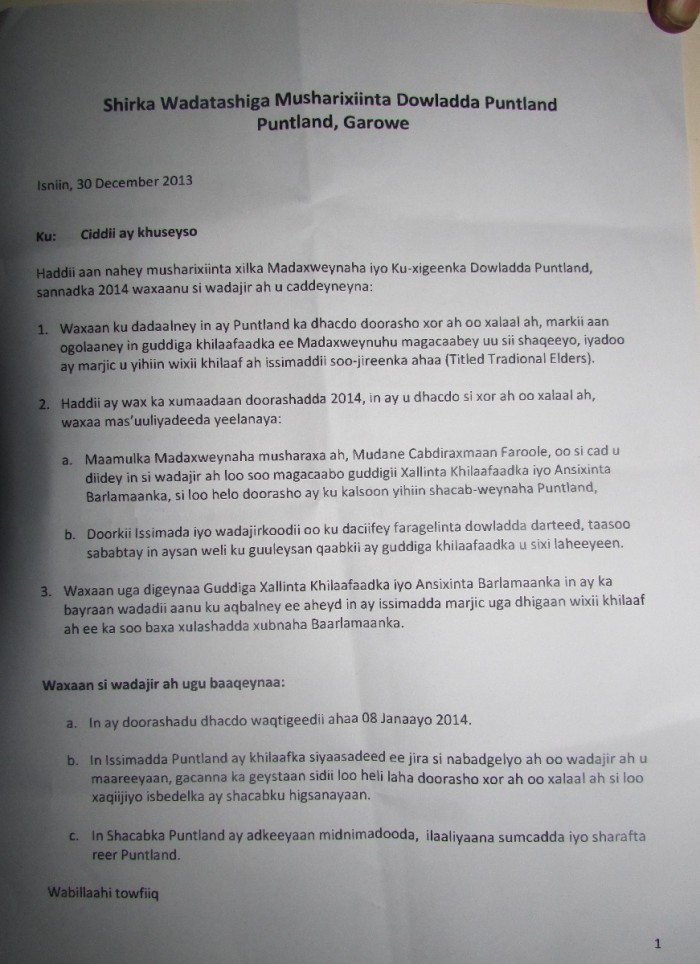 MURASHAXIINTA PUNTLAND: "Haddii wax ka xumaadaan doorashada waxaa Mas’uuliyaddeeda leh Maamulka Faroole”