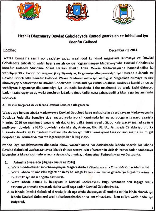 Hadaba hoos ka aqriso heshiiskii ay kala sixiixdeen labada maamul.