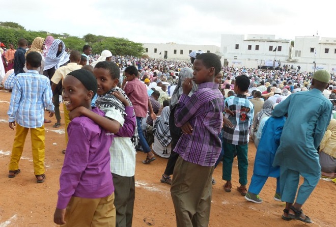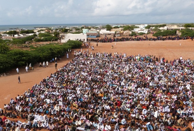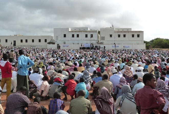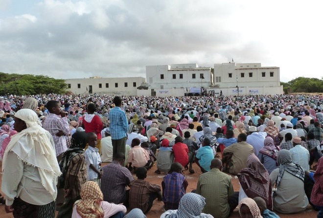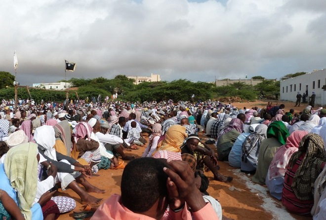 Isniin, July 28, 2014 (HOL) — Kumannaan dadweyne ah oo ku noo degmada Baraawe ee gobolka Shabeellada Hoose iyo mas’uuliyiin ka tirsan Al-shabaab ayaa maanta salaaddii ciidda ku tukaday fagaaro weyn oo ku yaalla degmadaas.