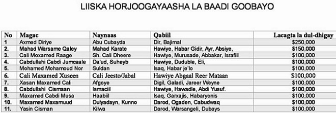 Ragga ay xukuumadda Soomaaliya lacagta ku raadinayso waxaa ka mid ah hoggaamiyaha guud ee Al-shabaab, Axmed Diiriye oo loo yaqaan Sheekh Axmed Cumar Abuu-cubeyda, kaasoo madaxiisa la dul-dhigay $250,000.
