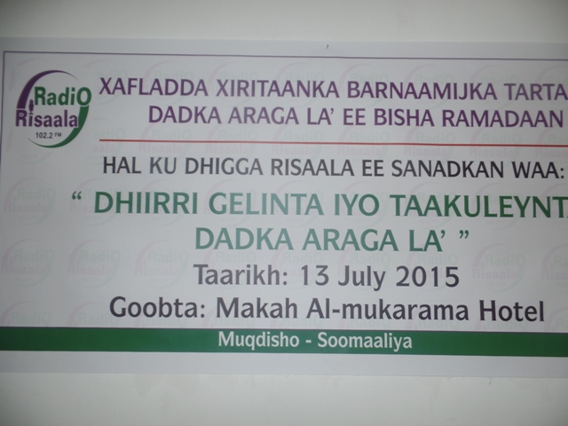 Isniin, Luuliyo 13, 2015 (HOL) — Idaacada Risaala ee Magaalada Muqdisho ayaa maanta waxa ay qabatay xaflad ballaaran oo lagu abaalmarinaayay Ardaydii Kaalmaha ka Galay Tartanka Qur’aan Akhriska Dadka Araga la’ ee Idaacada Risaala, sidoo kale Xafladdaan waxaa lagu ciidseeyay oo lacago lagu siiyay dhamaan dadkii Araga la’aa ee ka qaybgalay Tartanka Qur’aan Akhriska Idaacada Risaala, waxaana xaflada ay ka dhacday Hoteelka Maka Al-Mukarama ee Magaalada Muqdisho.