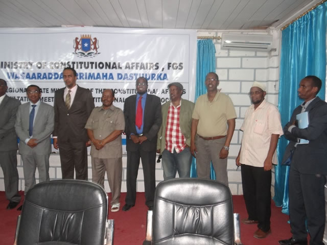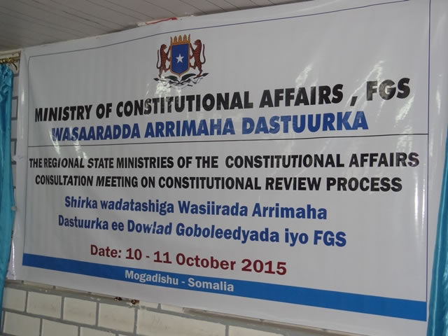 Sabti, Oktoobar 10, 2015 (HOL) — Shirka looga hadlayo dar-dar-galinta hannaanka dib-u-eegista dastuurka KMG ah ee dalka ayaa maanta ka furmay Muqdisho, iyadoo ay ka qayb-galeen ra’iisal wasaare ku-xigeenka xukuumadda Somalia, wasiirka dastuurka, wasiirrada arrimaha dastuurka ee maamul goboleedyada, Puntland, Koonfur-galbeed, Jubbaland iyo Galmudug, guddigiga kormeerka dastuurka ee baarlamaanka Somalia iyo guddiga madaxa-banaan ee dib u eegista dastuurka KMG ah iyo hirgelintiisa.