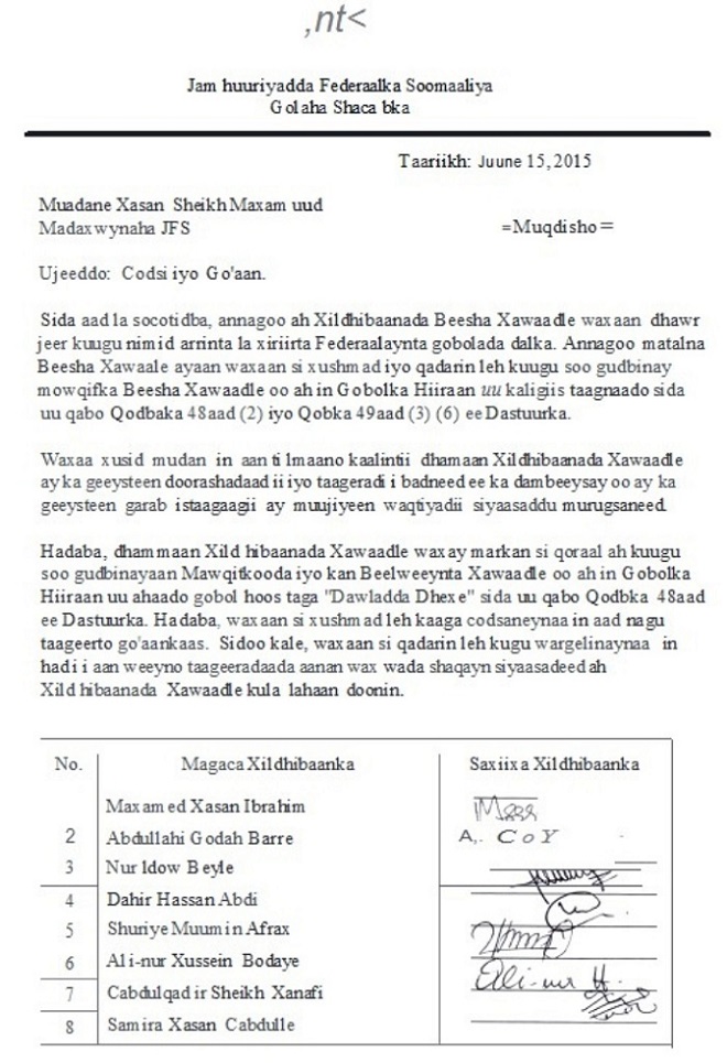 Talaado, Juun 16, 2015 (HOL) — Sideed xildhibaan oo ka tirsan Baarlamaanka Somalia ayaa ugu baaqay Madaxweynaha Dowladda Soomaaliya Xassan Sheekh Maxamuud inuu Tix-geliyo rabitaanka siyaasiyiinta iyo bulsho-weynta ku dhaqan gobolka Hiiraan.