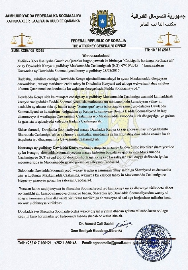 Sabti, Oktoobar 10, 2015 (HOL) — Xeer-ilaayaha Guud ee Qaranka Somalia, Dr. Axmed Cali Daahir ayaa qoraal uu soo saaray maanta kaga hadlay qorshaha ay Kenya ku doonayso inay isku hor-taagto dacwadda badda ee Somalia ay horay ugu gudbisay Maxkamadda ICJ u gudbisay.