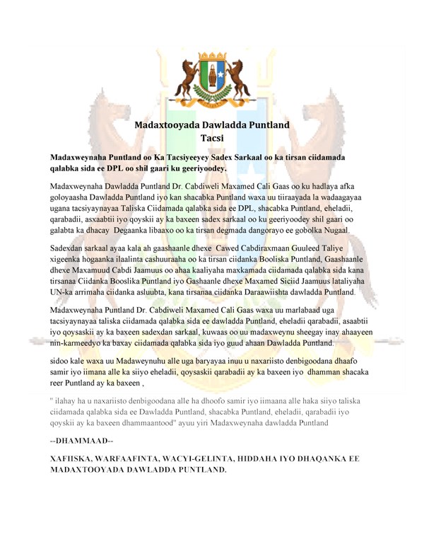 Madaxweynaha Maamulka Puntland, Cabdiwali Maxamed Cali Gaas, ayaa tacsi u diray, ehelada iyo ciidamada maamulka Puntland.