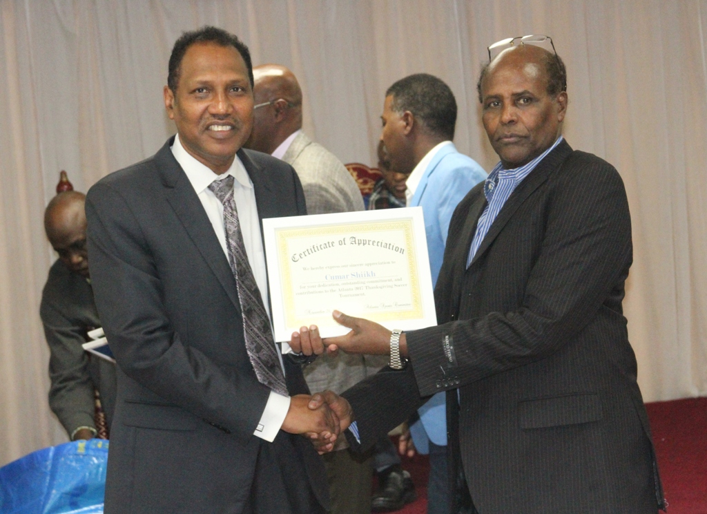 Dhanka kale Guddoomiyaha Guddiga Ciyaaraha Soomaaliyeed ee Atlanta Dr Cali Cusmaan, ayaa oga mahad celiyay dhammaan ciyaartooydii iyo howl-wadeenadii ka qeyb galay tartankaan, wuxuuna amaanay qaabkii ciyaaruhu ay sannadkaan u dhaceen.