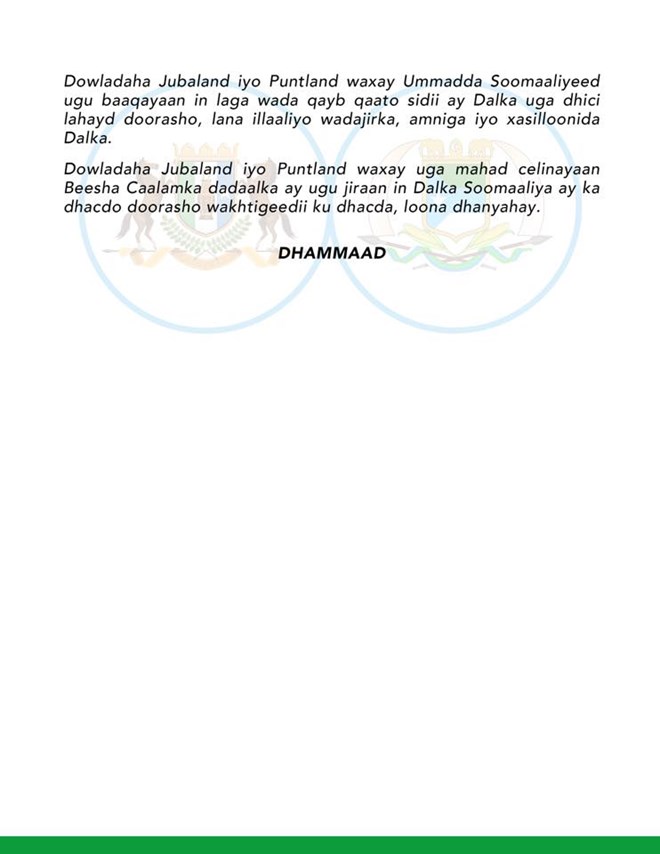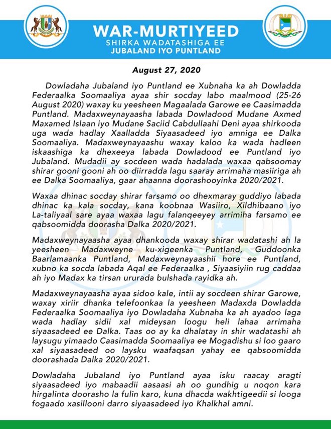 Khamiis, Agoosto 27, 2020 (HOL) - Warsaxaafadeed kasoo baxay shirkii magaalada Garowe uga socday Puntland iyo Jubbaland ayaa lagu sheegay in madaxda labada maamul ay qeyb ka ahaanayaan shir wadatashi oo Muqdisho ka dhacaya loogana hadlayo sidii xal siyaasadeed looga gaari lahaa doorashooyinka Soomaaliya.