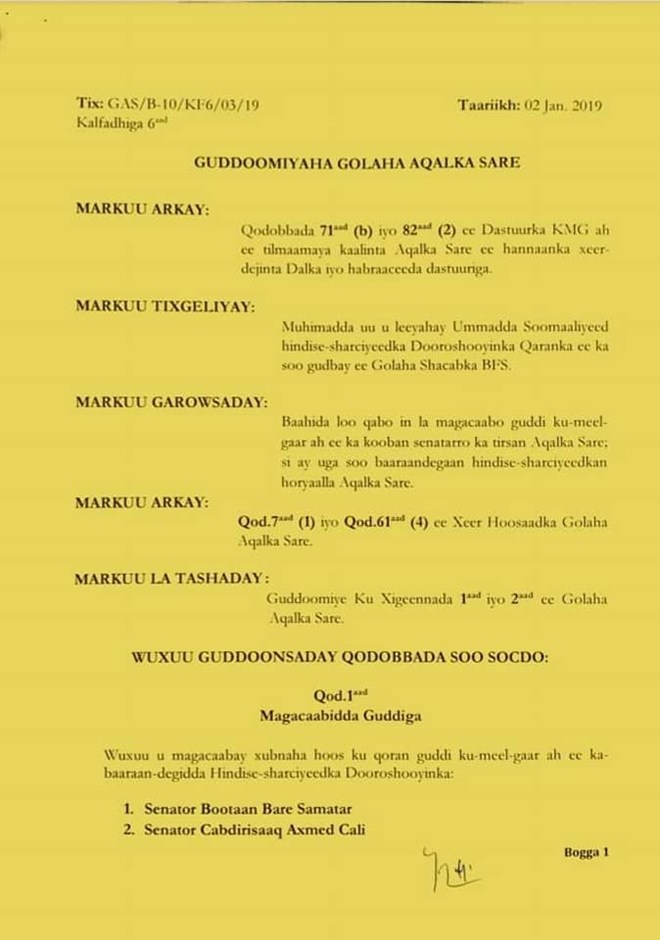 Sabti, Janaayo, 04, 2020 (HOL)- Barlamaanka aqalka sare ee Soomaaliya ayaa guddi ka kooban 7 Xubnood ah u xil saaray inay kasoo talo bixiyaan sharciga doorashooyinka Qaran ee dalka.