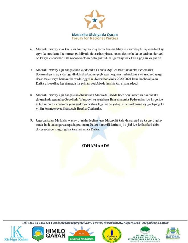 Jimco, September 18, 2020 (HOL) - Madasha xisbsiyada siyaasadeed ee Soomaaliya ayaa soo dhoweeyay natiijadii kasoo baxday wada hadalkii dowladda federalka iyo dowlad goboleedyada, kaasoo ugu dambayn heshiis looga gaaray hannaanka doorashada soo socota.