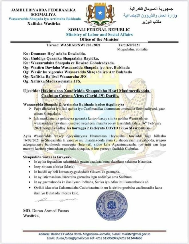 Arbaco, Feberaayo, 17, 2021 (HOL) - Wasaaradda shaqada iyo arrimaha bulshada xukuumada Soomaaliya ayaa hakisay isku imaatinka shaqaalaha iyo xaadirintooda si looga fogaado faafidda Covid-19.