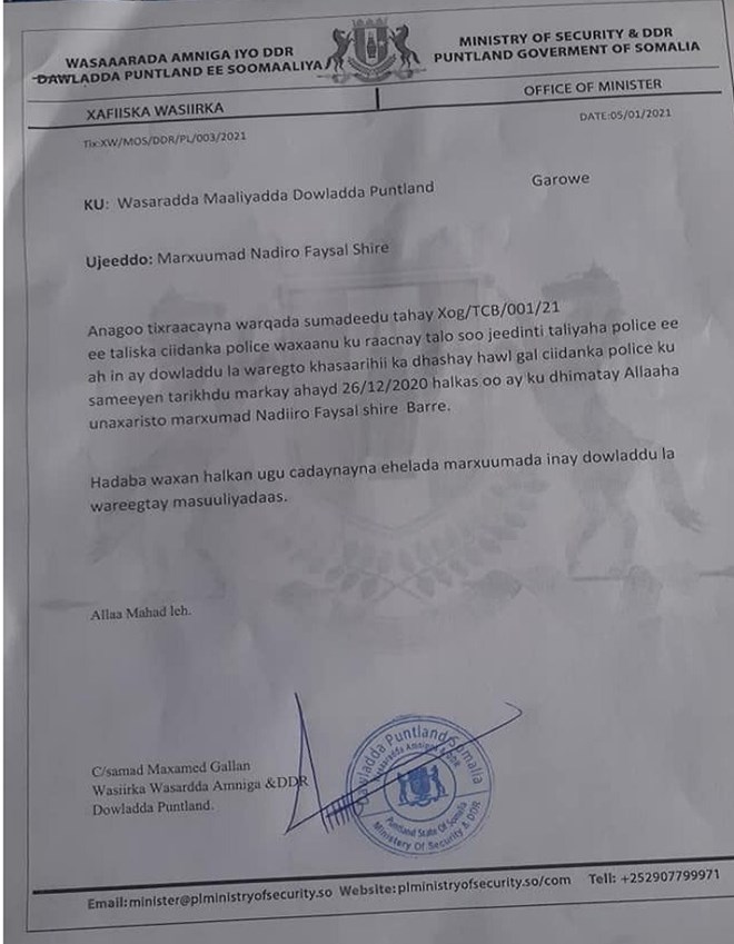 newsinsideWasiirka amniga Puntland Cabdisamad Gallan ayaa soo saaray qoraal uu ku caddaynayo in ay la wareegeen masuuliaydda geerida Nadiiro Feysal Shire Barre oo sababsatay rasaasta ciiddanka amniga.