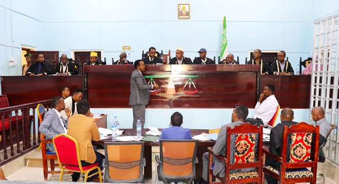 Gudoomiyaha maxkamada sare garyaqaan Aadan Xaaji Cali iyo 9 garsoore, oo ay wehelinayso kaliyaha maxkamada dastuuriga ah Sahra Ismacil Cabdilahi, ayaa dhagaystay dacwadaha.