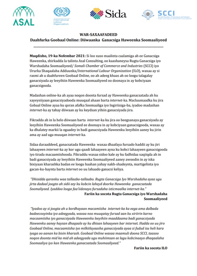 Talaado, November, 23, 2021 (HOL) - Shirkadda la talinta Asal Consulting, oo kaashaneysa Rugta Ganacsiga iyo Warshadaha Soomaaliyeed iyo Ururka Shaqaalaha adduunka, ayaa waxay si rasmi ah u daah fureen Goobaal Online, oo ah adeeg loogu tala galay ganacsiyada ay leeyihiin Haweenka Soomaaliyeed oo doonaya in ay kobciyaan ganacsigooda.