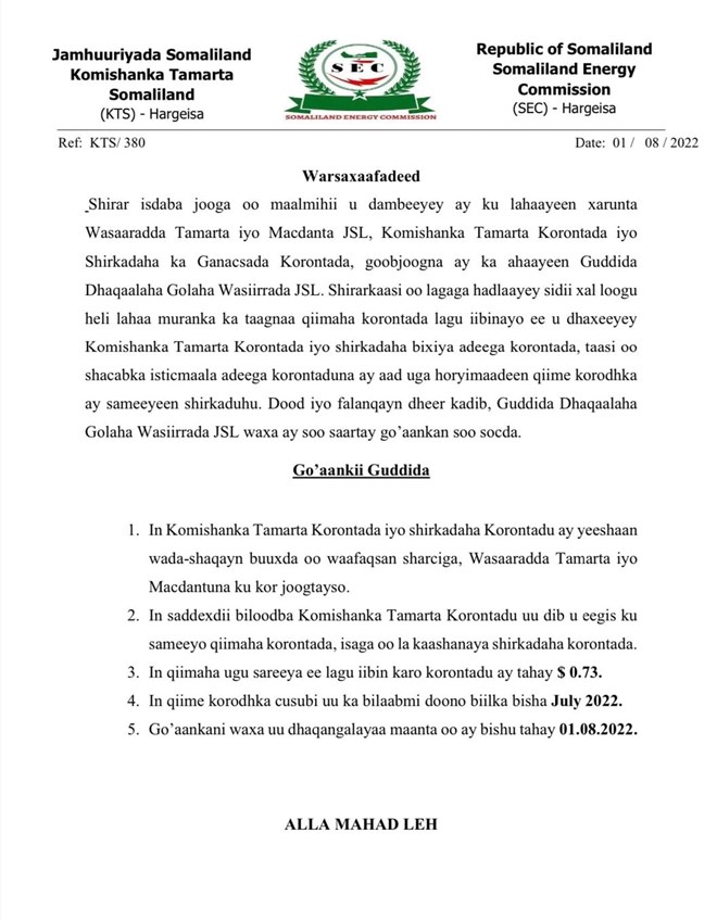 Talaado, Ogosto, 2, 2022 (HOL) - Xukuumada Somaliland iyo shirkadaha laydhka, ayaa ku heshiiyay in qiimaha korontada halkii unit lagu iibiyo $0.73, isla markaana aan la jarin korontada habeenkii.