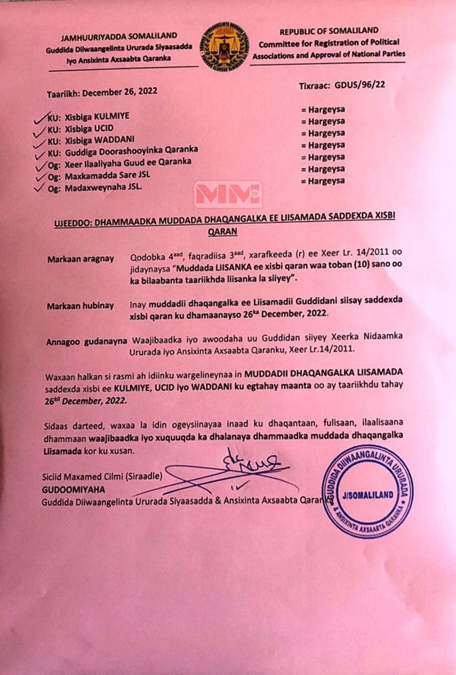 Isniin, December, 26, 2022 (HOL) - Guddida Diwaangalinta Ururada Somaliland, ayaa ku dhawaaqday in uu dhacay liisankii xisbinimo ee xisbiyada WADDANI, UCID iyo Kulmiye.