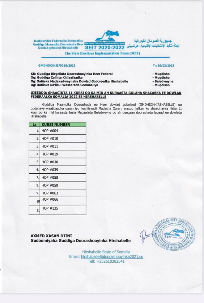 Sabti, Febraayo, 26, 2022 (HOL) - Guddiga doorashada maamulka Hirshabeelle ayaa shaaciyay 11 kursi oo ah qeybtii labaad ee kuraasta taala magaalada Baledweyne ee xarunta gobolka Hiiraan.