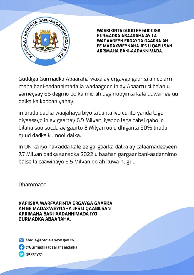 "6.9 Milyan oo Soomaali ah ayaa wajahaya biyo la'aan iyo cunto yari, waxaana laga cabsi qabaa in tiradaasi gaadho 8 Milyan" ayaa lagu yiri warbixinta uu soo saaray ergayga arrimaha bini'aadantinimada Soomaaliya Cabdiraxmaan Cabdishakuur.