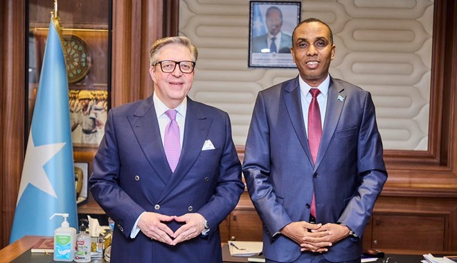 Isniin, November, 7, 2022 (HOL) - Raysal wasaaraha Xukuumadda Fedaraalka Soomaaliya Xamse Cabdi Barre ayaa Maanta xafiiskiisa ku qaabilay safiirka dalka Filand ee Soomaaliya Pirkka Tapiola, oo ay ka wada hadleen xoojinta xiriirka labada dowladood iyo dadaalada dib u xoreynta ee dowladda Soomaaliya ay ku ciribtiteyso kooxda Al-shabaab.