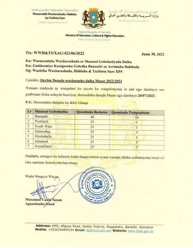 newsinsideQoraal ku taariikhaysanaa bishii june dhammaadeedkii ayaa dowlad goboleedyada lagu wargaliyay inay soo gudbiyaan ardayda buuxisay sharuudaha deeqda waxbarashada, ugu dambayn 20-kii bishii 7-aad ee tagtay.