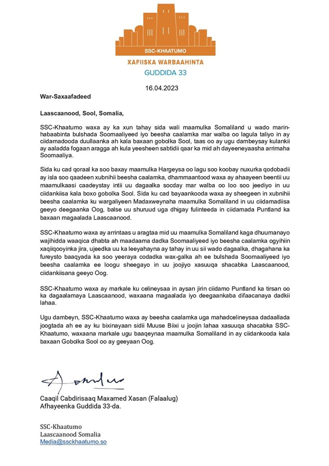 Ugu danbayn, waxay SSC-Khaatumo Somaliland ugu baaqday in ay ciidankeeda kala baxdo deegaanada SSC.