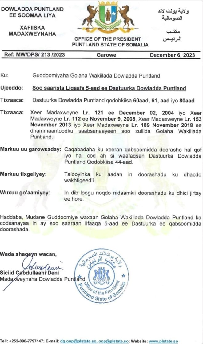 Khamiis, December, 7, 2023 (HOL) - Madaxwenaha Puntland Siciid Cabdullaahi Deni ayaa baarlamaanka u gudbiyay codsi ku aaddan inuu soo saaro baarlamanku lifaaqa 5-aad ee lagu galayo doorashada.