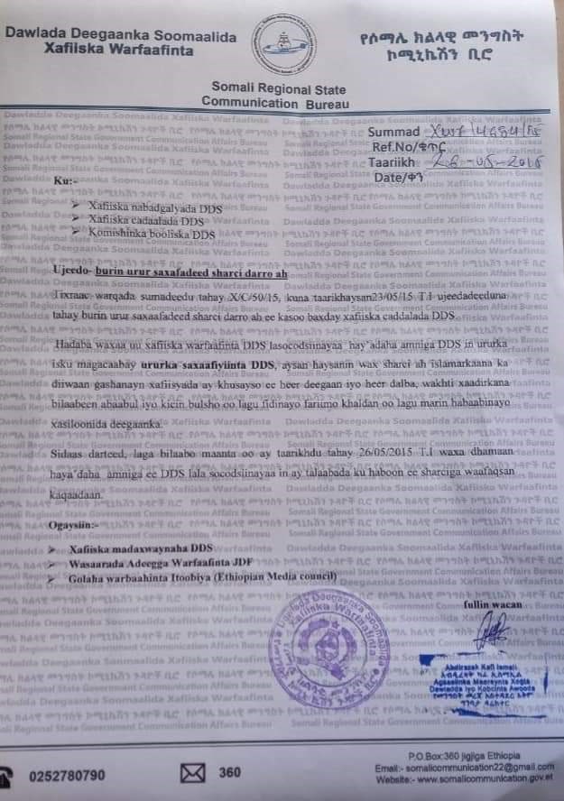 newsinsideHaddaba Warqad goor dhawayd kasoo baxday Xafiiska Warfaafinta ee dowlad degaanka Soomaalida, ayaa lagu sheegay in Ururkaas la magac baxay Ururka Saxafiyiinta degaanka Soomaalida uusan haysanin wax sharciyad ah, islamarkaana aysan ka diiwaan gashanayn heer degaan iyo heer dalba.