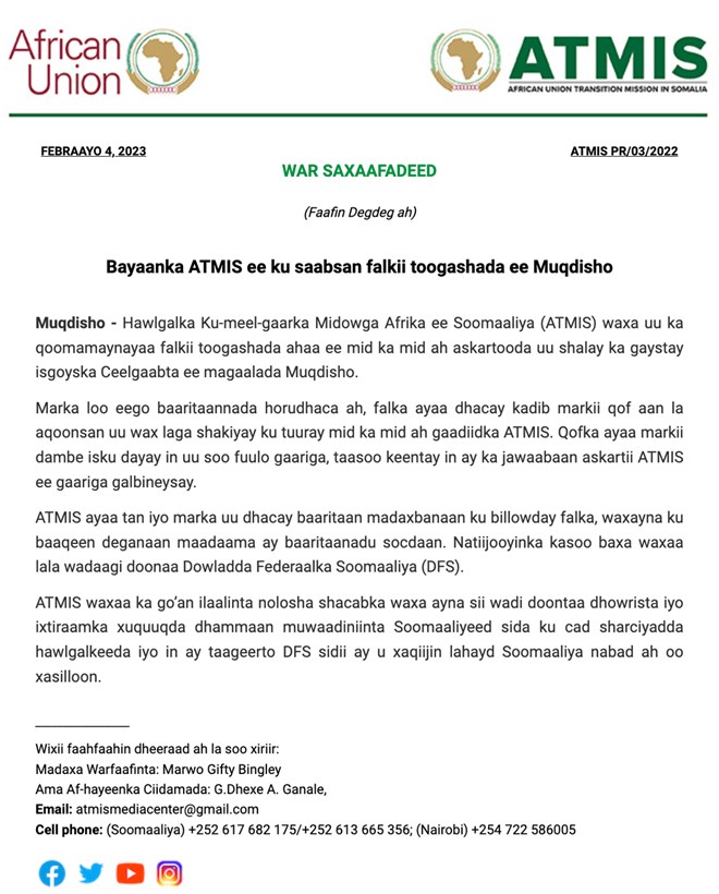 Sabti, February, 4, 2023 (HOL) - Taliska ciidamada Midowga Afrika ee ATMIS ayaa sheegay inay ka xun yihiin dil askari katirsan ciidankooda uu ka geystay Isgoyska Ceelgaabta ee magaalada Muqdisho.