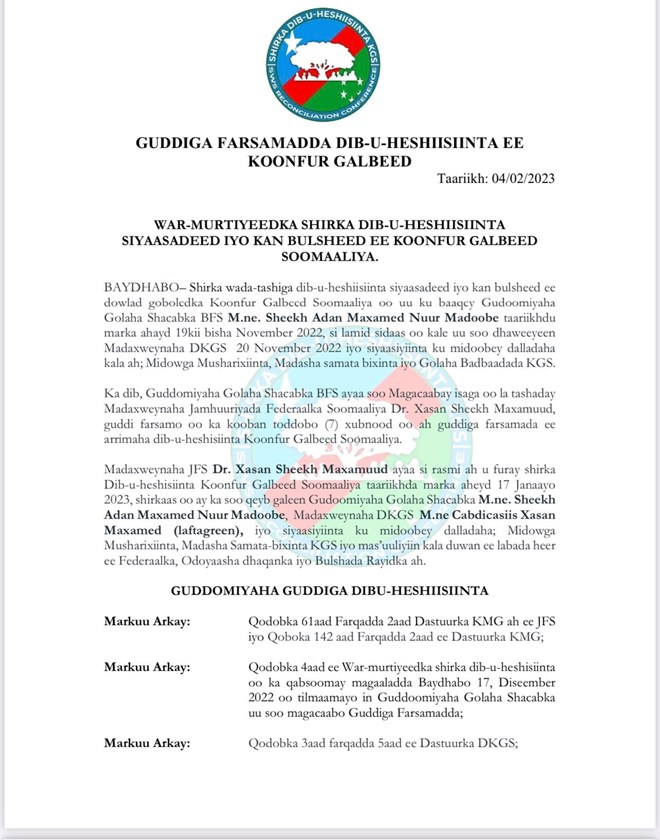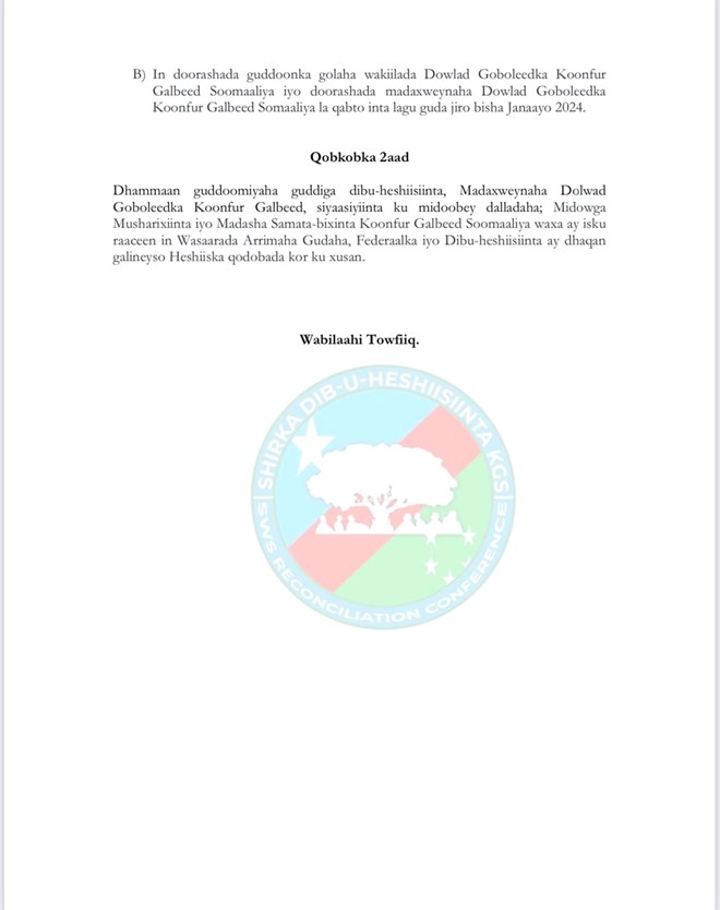 Axad, February, 5, 2023 (HOL) - War murtiyeed kasoo baxay shirkii dib u heshiisiinta Koonfur Galbeed ayaa heshiis looga gaaray khikaafkii xooganaa ee ka dhashay doorashada maamulkaas.