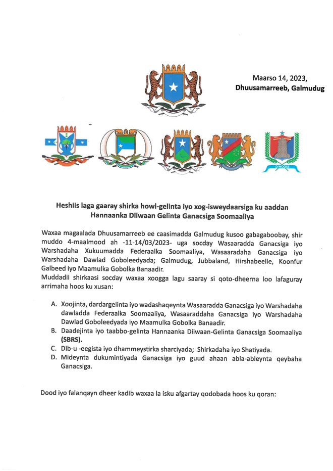 Arbaco, Maarso, 15, 2023 (HOL) - Waxaa magaalada Dhuusamareeb ee xarunta maamulka Galmudug lagu soo gabagabeeyay shir afartii maalmood ee lasoo dhaafay halkaasi uga socday Wasaaradda Ganacsiga Xukuumadda Federaalka Soomaaliya iyo Wasaaradaha Ganacsiga dowlad gooboleedyada kala ah Galmudug, Jubbaland, Hirshabeelle, Koonfur Galbeed iyo Maamulka Gobolka Banaadir.