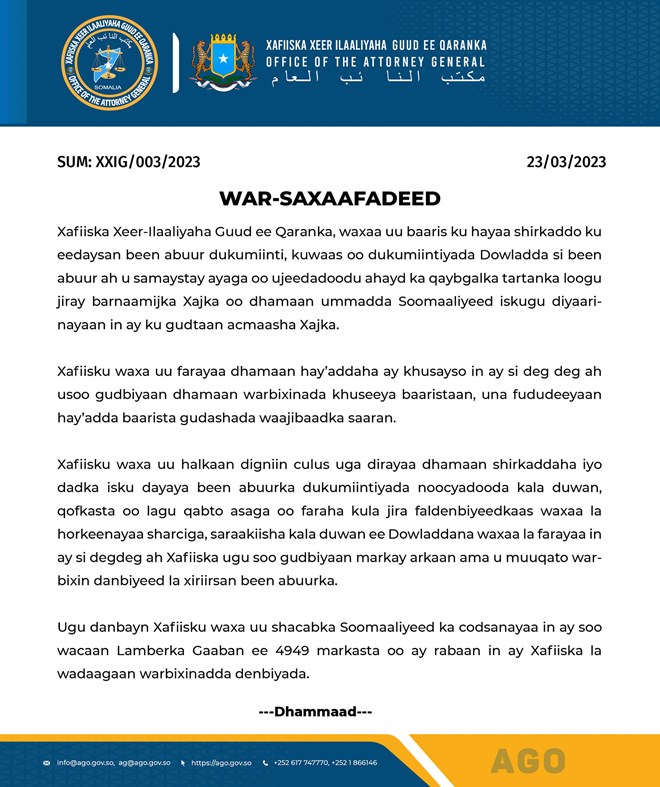newsinsideXafiiska Xeer ilaaliyaha guud ee dowladda Soomaaliya, ayaa ku wargaliyay hay’adaha ay baaristaan qusayso inay si degdeg ah usoo gudbiyaan warbixinnada quseeya baaristaan, si ay dowladdu waajibaadkeeda uga gudato dadka ku lugta leh arrimahan.