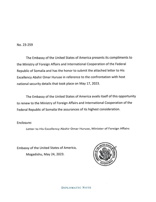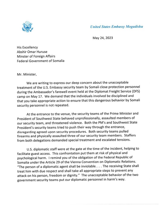 Sabti, May 27, 2023 (HOL) - Safaaradda dowladda Mareykanka ee Soomaaliya ayaa warqad eedeyn ah u gudbisay Wasiirka Wasaaradda arrimaha Dibadda Soomaaliya Abshir Cumar Jaamac Haruuse, taasi oo ay kaga cabaneysay Safaaradda ilaalada Raysal wasaaraha Soomaaliya iyo madaxweynaha maamulka Koonfur Galbeed.