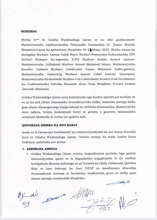Axad, May 28, 2023 (HOL) - Golaha wadatashiga qaran ee Soomaaliya ayaa xalay goor dambe war saxaafadeed kasoo saaray shirkii uga socday magaalada Muqdisho, iyagoo heshiis ka gaaray arrimaha doorashada.