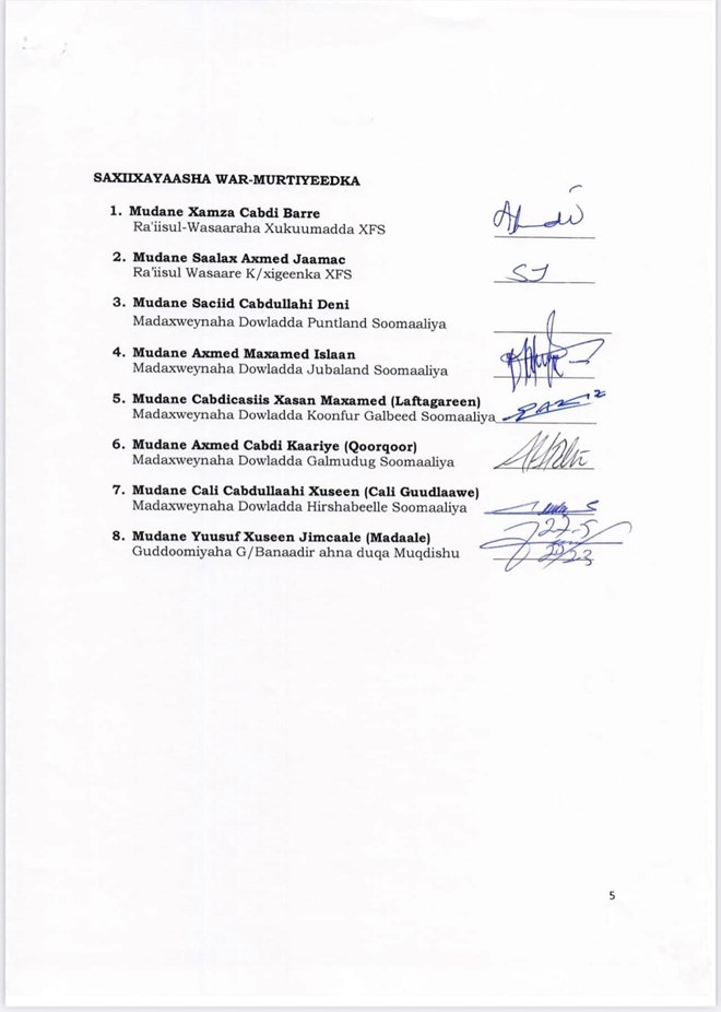 Madaxweynaha Puntland Siciid Deni ayaa ka maqan heshiiskan lagu saxiisay Muqdisho.