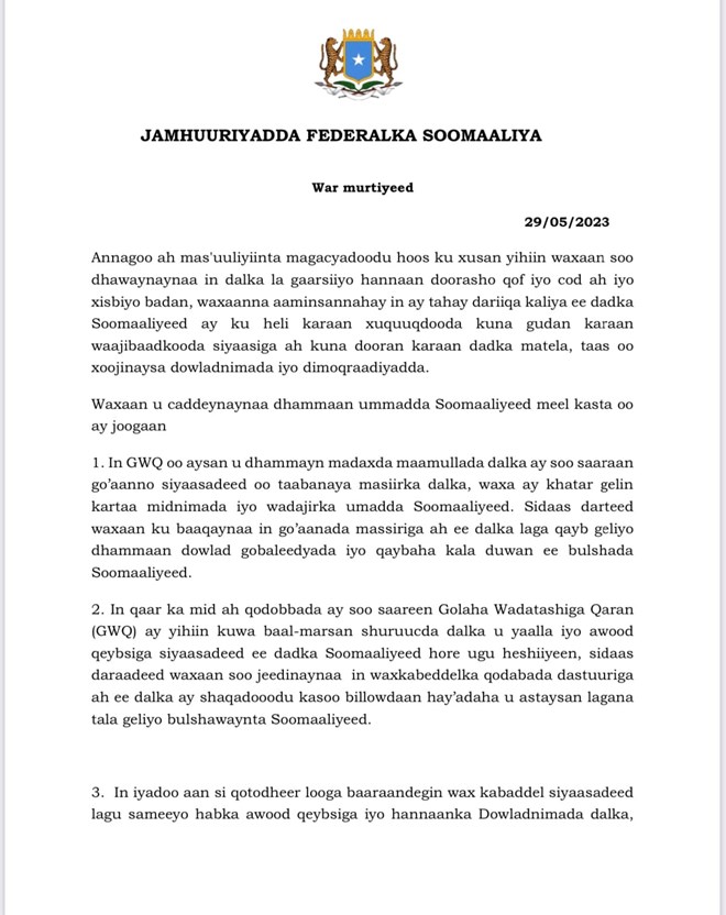 Isniin, May 29, 2023 (HOL) - Madaxweynayaal hore, Ra’iisul Wasaarayaal hore, xidhibaano iyo sidoo kale siyaasiyiin horey xilal usoo qabtay ayaa ka soo horjeestay go’aanadii Golaha Wadatashiga Qaran ee doorashada, iyagoo ku tilmaamay kuwa baalmarsan shuruucda dalka iyo awood qeybsiga.