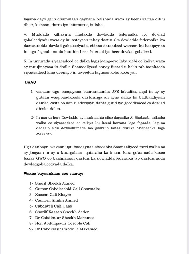 Waxay bayaankooda baaq ugu soo jeediyeen labada aqal ee barlamaanka, iyagoo ugu baaqay inay gutaan waajibaadkooda dastuuriga ah, si ay dalka uga badbaadiyaan waxay ugu yeereen damac kaste oo aan u adeegayn dowlad dhiska Soomaaliya.