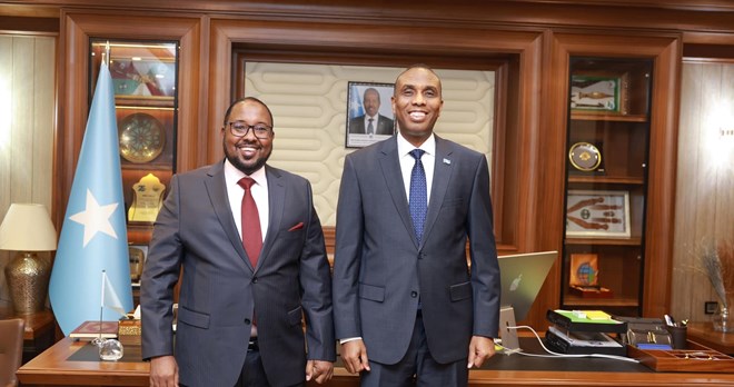 Sabti, October, 7, 2023 (HOL) - Ra'iisul wasaaraha xukuumadda Soomaaliya Xamsa Cabdi Barre, ayaa Xafiiskiisa ku qaabilay hoggaamiyaha SSC- Khaatumo Cabdiqaadir Axmed Aw-Cali (Firdhiye), kaasoo Muqdisho ku tagay casuumaad rasmi ah oo dowladdu u fidisay.