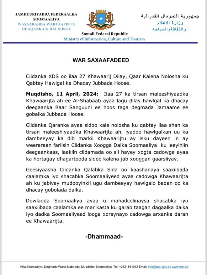 Jimco, April, 12, 2024 (HOL) - Illaa 27 ka tirsan dagaalamayaasha kooxda Al-Shabaab ayaa lagu dilay hawlgal ka dhacay deegaanka Baar Sanguuni ee hoos taga degmada Jamaame ee gobalka Jubbada Hoose, sida ay sheegtay dowladda Soomaaliya.