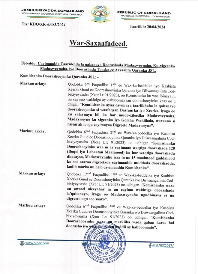 Sabti, April, 20, 2024 (HOL) - Guddida Doorashooyinka Somaliland ayaa ku dhawaaqday in doorashooyinka isa saaran ee madaxtooyada iyo axsaabta siyaasadu ay qabsoomi doonaan 13, November, 2024.
