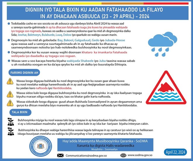 Talaado, April, 23, 2024 (HOL) - Iyadoo roobabka Guga ay ka curteen inta badan gobolada dalka ayaa hadana, hay'adda maareynta iyo musiibooyinka qaranka Soomaaliyeed ee SODMA waxay soo saartay digniino ku aadan roobab xoogan oo dhamaadka bishaan ka da'aya gobolada dalka.