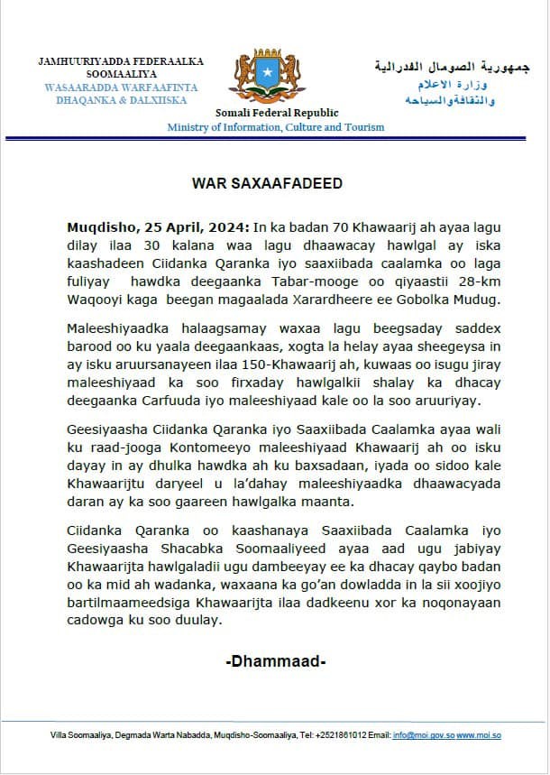 Khamiis, April, 25, 2024 (HOL) - Dowladda Fedaraalka Soomaaliya ayaa faahfaahin ka bixisay howlgal culus oo maanta oa dhacay dhulka howdka ah ee ku yaala deegaanka Tabar mooge oo qiyaas ahaan 28 KM dhanka Waqooyi kaga beegan degmada Xarardheere ee gobolka Mudug.