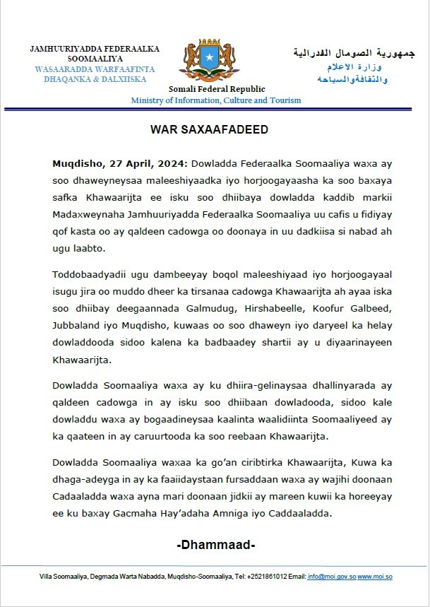 “Dowladda Soomaaliya waxa ay ku dhiira-gelinaysaa dhallinyarada ay qaldeen cadowga in ay isku soo dhiibaan dowladooda, sidoo kale dowladdu waxa ay bogaadineysaa kaalinta waalidiinta Soomaaliyeed ay ka qaateen in ay carruurtooda ka soo reebaan Khawaarijta.” Ayaa lagu yiri war saxaafadeed kasoo baxay wasaaradda warfaafinta dowladda Soomaaliya.
